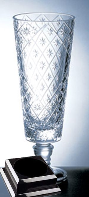 This elegant crystal vase is the perfect accolade for any achievement. This crystal was made in Italy and comes with a black finish base. With its perfect design, this vase makes for a great award for the over-achiever at your company.